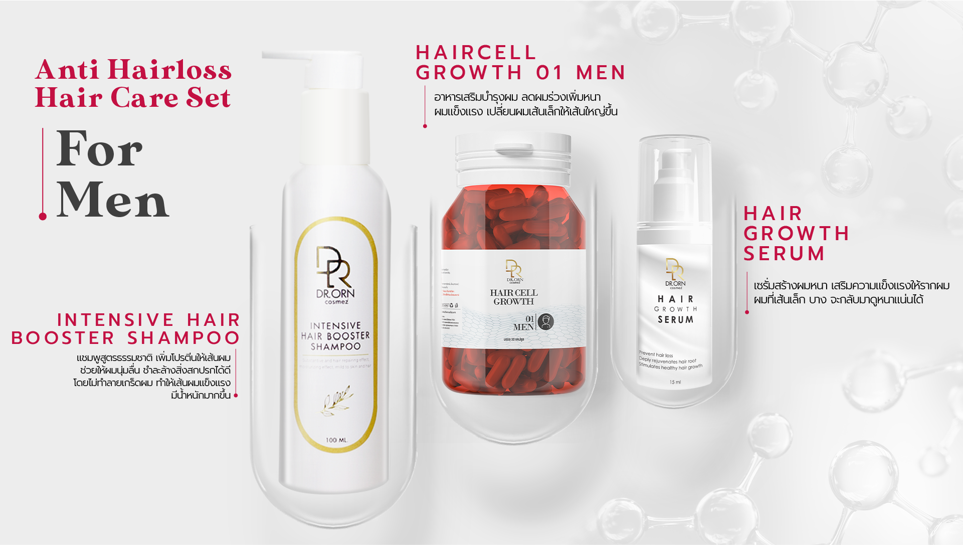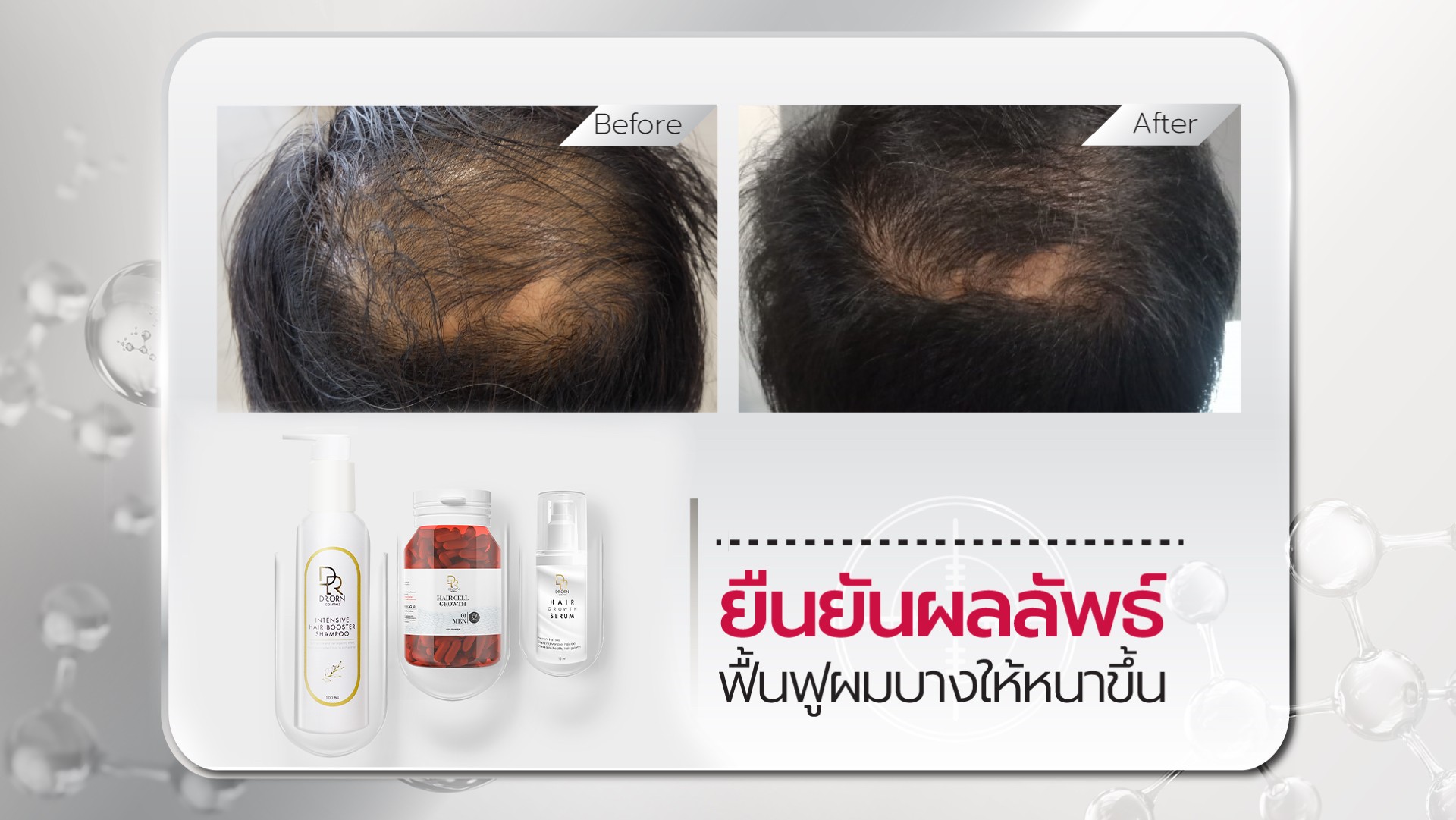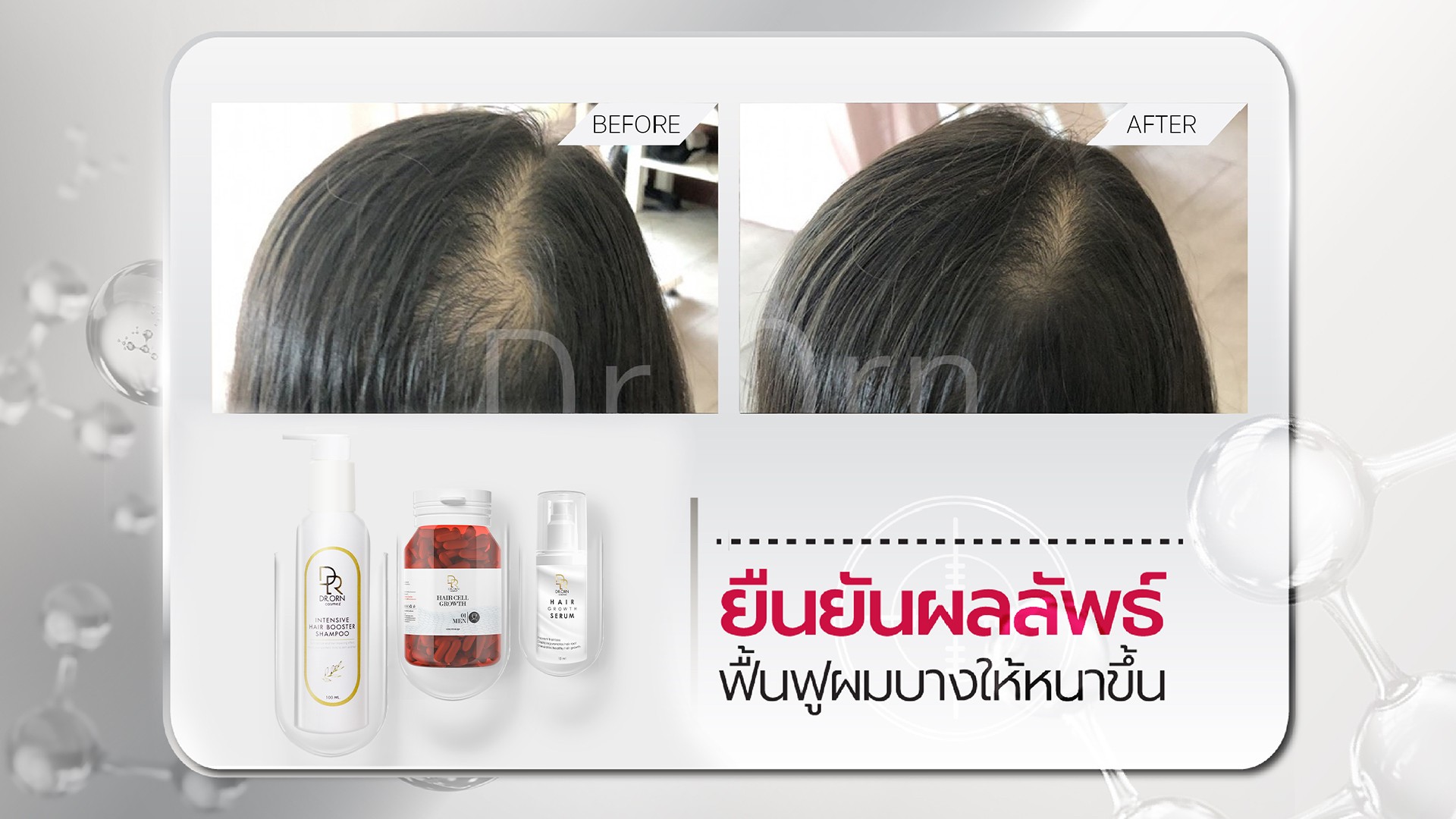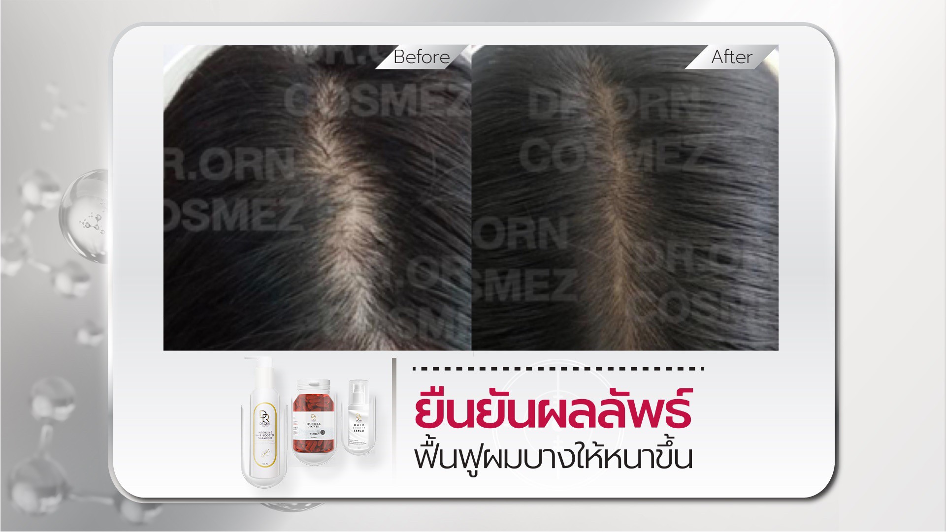 ดูแลผมด้วยผลิตภัณฑ์ Dr.Orn Cosmez ได้รับการยอมรับจากแพทย์เส้นผมทั้งในและต่างประเทศ เป็นผลิตภัณฑ์ระดับ Medical grade วิจัยใน Lab ของยุโรป มีงานวิจัยรองรับว่าปลอดภัยและเป็นผลจริงและยังได้รับรางวัลมากมาย ทั้ง Mibelle award, Advance ingredient award, Best quality hair care award