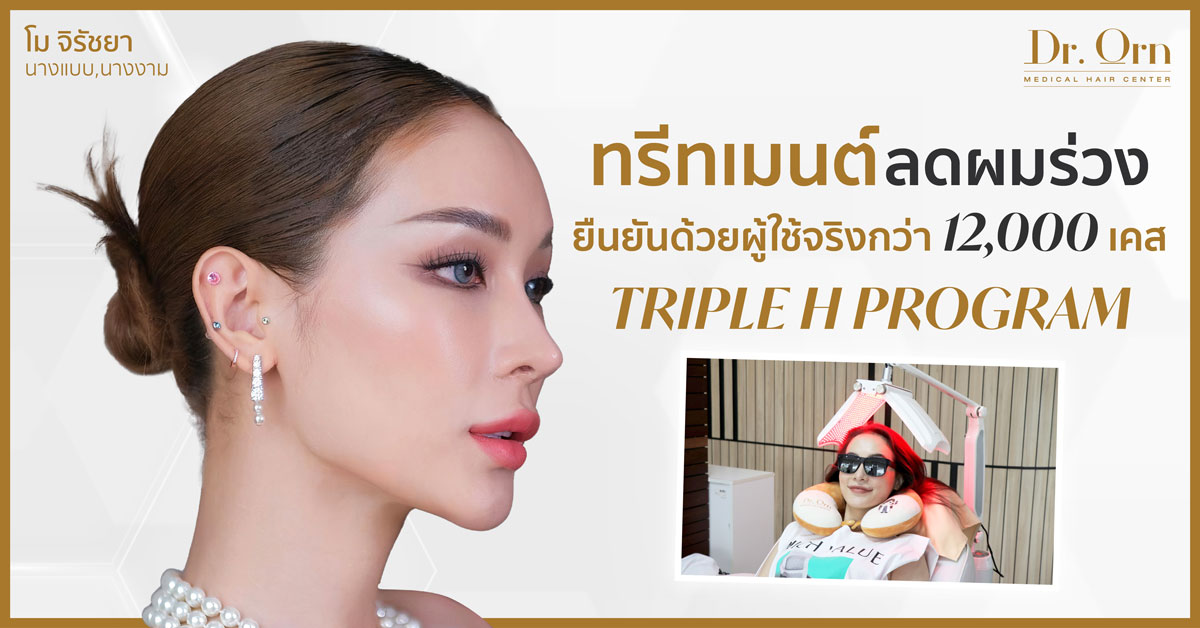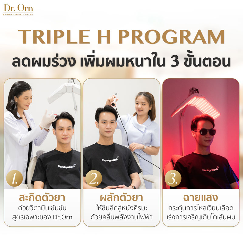 ผมร่วง ผมบาง ดูแก่กว่าอายุ ทำให้คุณรู้สึกขาดความ “มั่นใจ” อยู่ใช่หรือไม่? เคยใช้ยาปลูกผมหรือเซรั่มปลูกผมมาก็ไม่เห็นผล อยากปลูกผมถาวรแต่ก็กลัวเจ็บหรือมีค่าใช้จ่ายที่สูงเกินกว่าที่ตั้งไว้ ควรทำอย่างไร? การทำทรีทเมนต์ลดผมร่วง Triple H Program คือทางออก ลดผมร่วงแบบไม่ต้องผ่าตัด ไม่ต้องเจ็บตัว เส้นผมแข็งแรงขึ้นตั้งแต่เดือนแรกที่ทำ