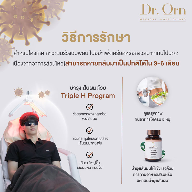 สำหรับใครเกิด ภาวะผมร่วงฉับพลัน ไปอย่าเพิ่งเครียดหรือกังวลมากเกินไปนะคะ เนื่องจากอาการส่วนใหญ่สามารถหายกลับมาเป็นปกติได้ใน 3-6 เดือนค่ะ ทั้งนี้ก็ควรดูแลสุขภาพ กินอาหารให้ครบ 5 หมู่ พักผ่อนให้เพียงพอ และสามารถบำรุงเส้นผมให้แข็งแรงยิ่งขึ้นด้วยการทานอาหารเสริมหรือวิตามินบำรุงเส้นผมเพิ่มได้
