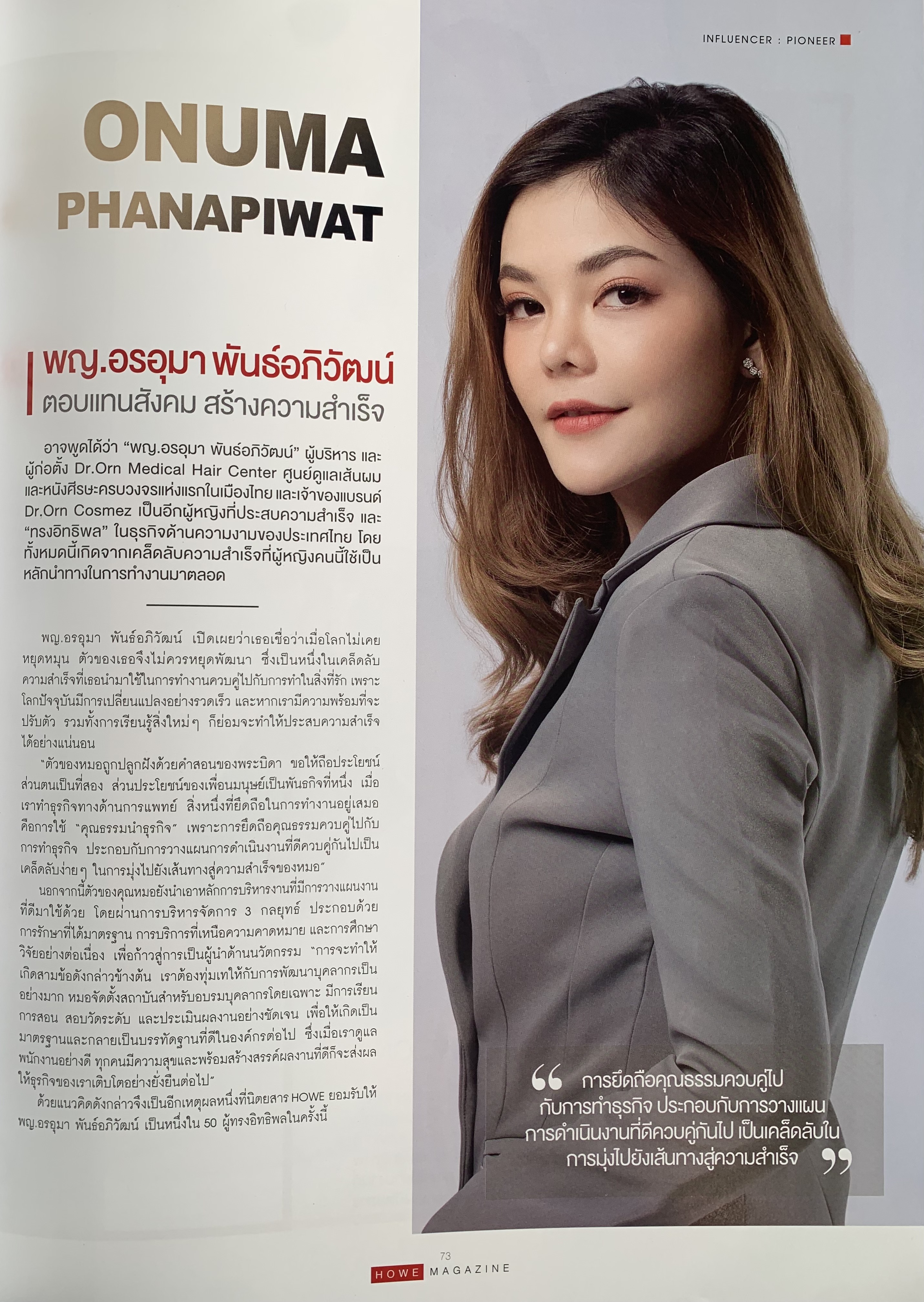 พญ.อรอุมา พันธ์อภิวัฒน์ ผู้บริหาร และผู้ก่อตั้ง Dr.Orn Medical Hair Center สถานบันดูแลเส้นผมครบวงจร 1 ใน 50 ผู้ทรงอิทธิพลแห่งโซเชียลมีเดียที่มีชื่อเสียง นักธุรกิจ นักบริหาร ที่ประสบความสำเร็จหลากหลายด้าน จากนิตยสาร ฮาว (Howe Magazine) ฉบับที่ 102