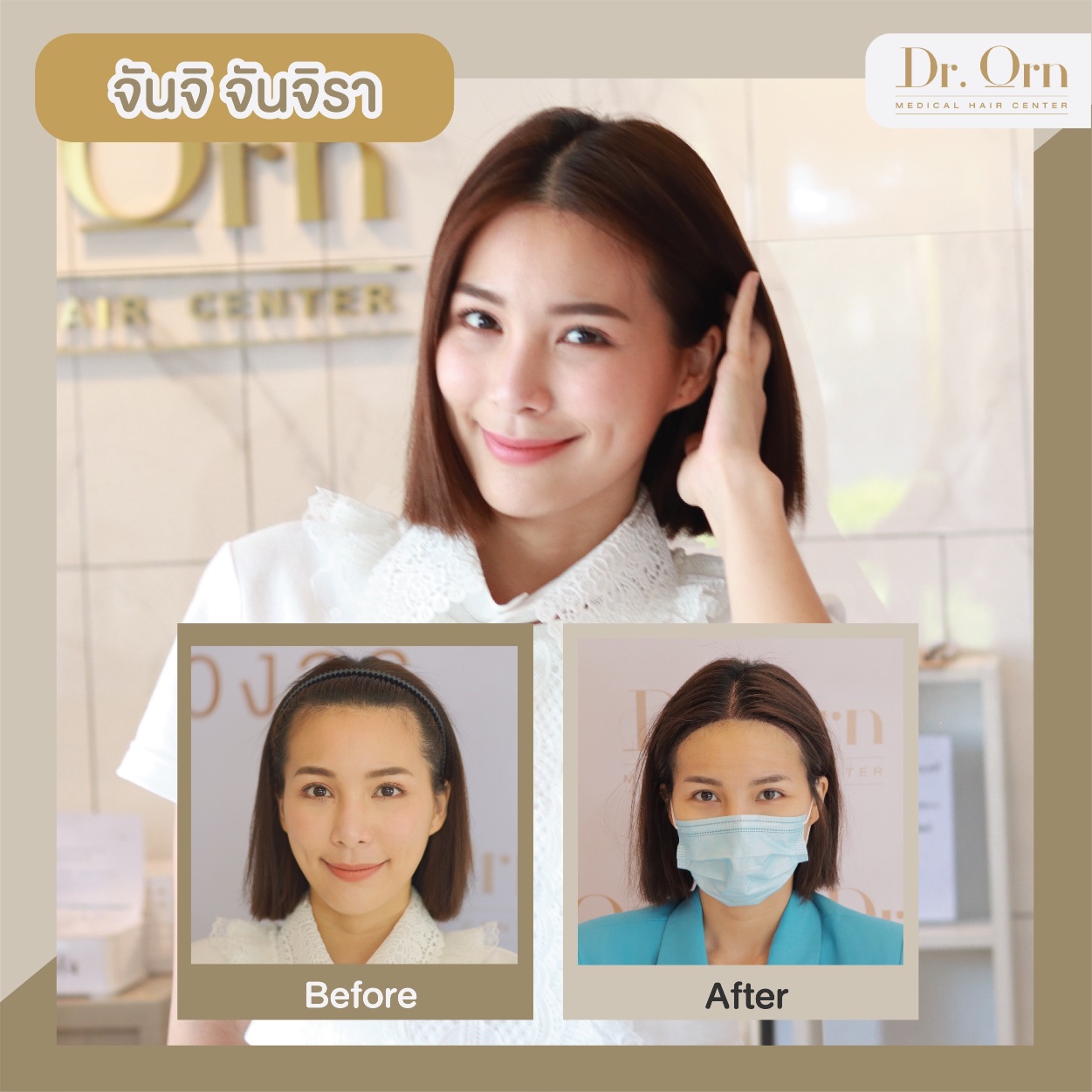 นักแสดงชื่อดังช่อง 3 ด้วยการที่คุณจันจิเป็นสายแด๊นซ์สุดมันส์ ก่อนจะเต้นก็มีโอกาสได้รวบผม หรือเสยผมบ่อยๆ จนทำให้เริ่มสังเกตได้ชัดว่าผมนั้นค่อนข้างบางและกรอบหน้าของคุณจันจิเองนั้นเว้าลึกสูงเข้าไประดับหนึ่งเลยแหละ จึงตัดสินใจมาปลูกผมสร้างกรอบหน้า เพราะเป็นปัญหากรอบหน้าเว้าลึก
