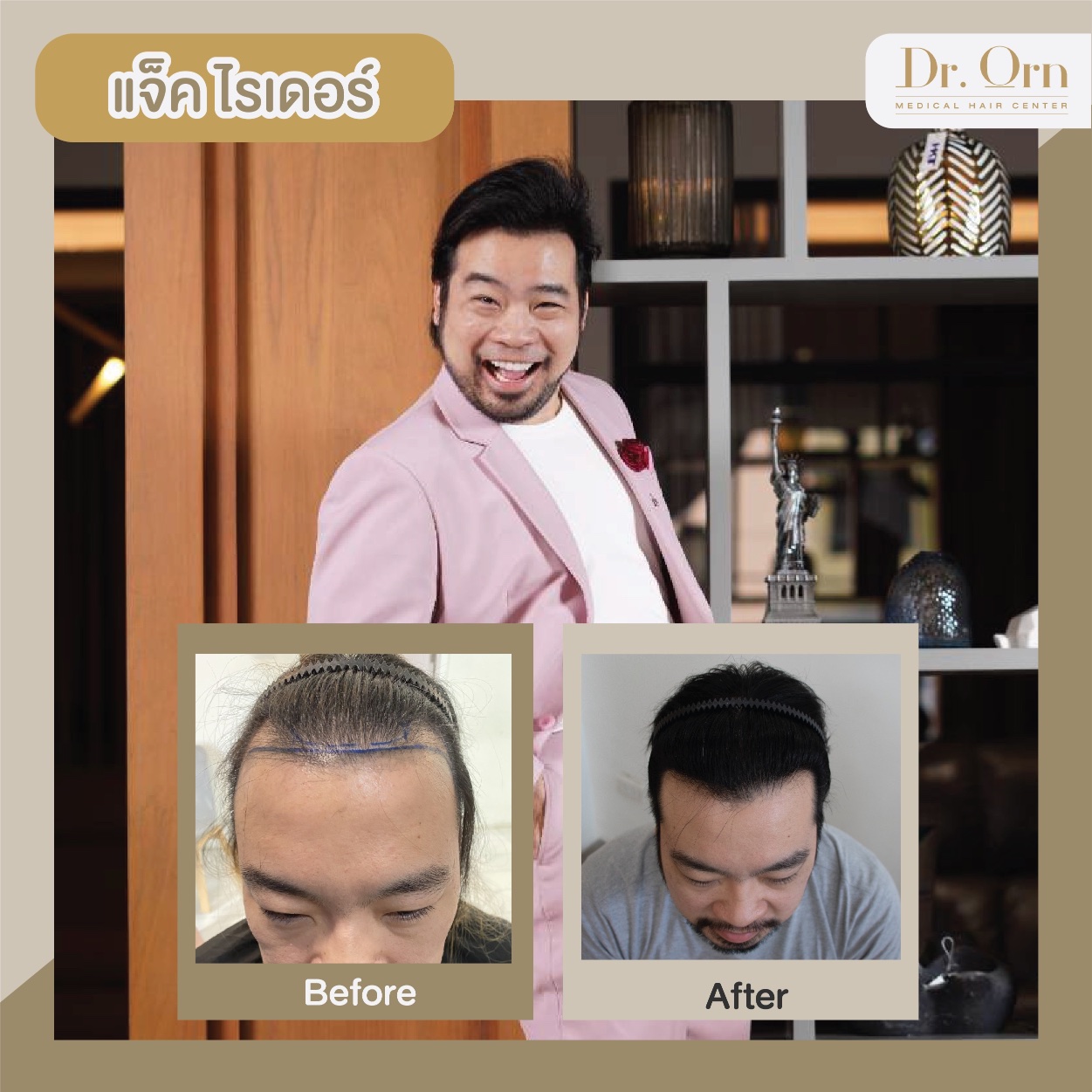 พิธีกรชื่อดัง ที่ไม่ว่าอีเว้นท์ไหนๆคุณแจ็คก็จะได้ครองไมค์รับบทพิธีกรอยู่เสมอ แต่พอสปอตไลท์ส่องมาทีไร ใจหายว๊าบทุกที เพราะทำให้เห็นชัดกับปัญหาผมบาง เส้นเล็กจึงต้องเลือกเซ็ททรงผมที่โป่งๆเพื่ออำพรางปัญหานี้ ซึ่งก็คอยปิดมาตลอดทุก ๆ งาน วันนี้คุณแจ็คบอกว่าถึงเวลาแล้วที่จะแก้ปัญหาอย่างตรงจุด จึงเลือกมาปลูกผมถาวร