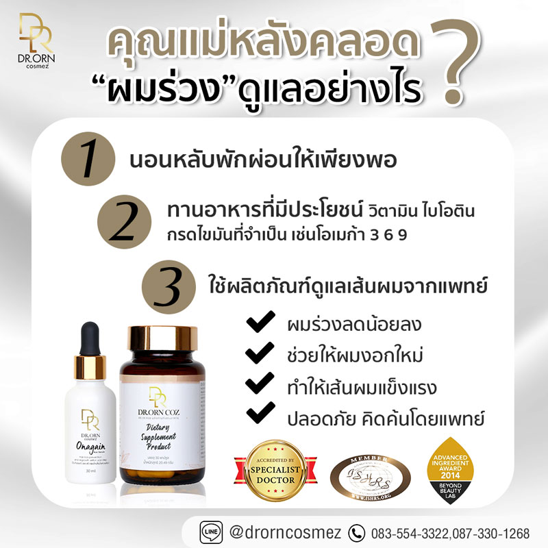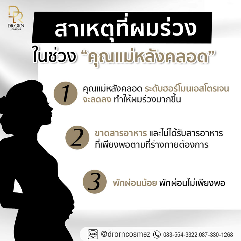 หากคุณแม่มีปัญหาผมร่วงมากผิดปกติหลังคลอดและปัญหายังคงเรื้อรังนานกว่า 1 ปี หรือผมบางลงอย่างผิดปกติกว่าตอนก่อนตั้งครรภ์รวมทั้งมีปัญหาหนังศีรษะล้านเป็นหย่อมๆหรือผมร่วงเป็นหย่อม ควรต้องปรึกษาแพทย์เพื่อวินิจฉัยอาการเพื่อรับการรักษาต่อไปเพราะอาการผมร่วงก็อาจเป็นสัญญาณของโรคบางชนิดได้ เช่น โรคโลหิตจางหรือโรคที่เกี่ยวกับต่อมไทรอยด์ คุณแม่มือใหม่ที่ยังไม่เคยเจอเหตุการณ์นี้อาจทำให้เกิดความเครียดและความกังวลใจที่ DR.ORN MEDICAL HAIR CENTER เรามีทีมแพทย์ผู้เชี่ยวชาญด้านการปลูกผมที่พร้อมให้คำปรึกษาและวางแผนในการบำรุงดูแลรักษาผมในระยะยาวรวมทั้งมีผลิตภัณฑ์บำรุงเส้นผมจากคลินิกที่สามารถนำกลับไปใช้ที่บ้านเหมือนมีแพทย์อยู่ใกล้ตลอดเวลา สำหรับใครที่สนใจสามารถสอบถามรายละเอียดเพิ่มเติมได้ที่ @drornclinic หรือคลิก http://bit.ly/2DaJw1Z