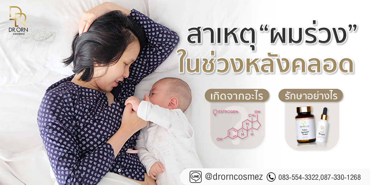 ปัญหาใหญ่ที่คุณแม่หลังคลอดกังวลก็คือ “ผมร่วงหลังคลอด” โดยอาการของผมร่วงหลังคลอดจะเป็นการร่วงกระจายไปทั่วบริเวณศีรษะจนสังเกตได้และร่วงได้มากถึง 400-500 เส้นต่อวัน (ในขณะที่คนปกติจะผมร่วงเพียงวันละ 100 เส้นเท่านั้น) คนท้องจะมีปริมาณของฮอร์โมนเอสโตรเจนที่สูงมากในช่วงตั้งครรภ์จึงดูเหมือนว่าจะมีผมดกดำหนาและสวยเป็นพิเศษ จนกระทั่งหลังคลอดลูกระดับฮอร์โมนก็จะค่อย ๆ ลดระดับลง ทำให้ช่วงนี้ผมคุณแม่จะร่วงมากจนสังเกตได้ชัดและจะกลับสู่ภาวะปกติประมาณ 6-12 เดือนหลังคลอด