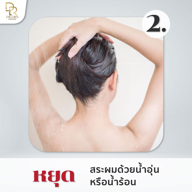2. สระผมด้วยน้ำอุ่นหรือน้ำร้อน เพราะการสระด้วยน้ำอุ่นจะทำให้หนังศีรษะแห้ง รูขุมขนเปิด รากผมอ่อนแอ จนทำให้เกิดผมร่วงง่ายนั่นเอง ดังนั้นควรสระผมด้วยน้ำธรรมดาจึงจะดีที่สุด