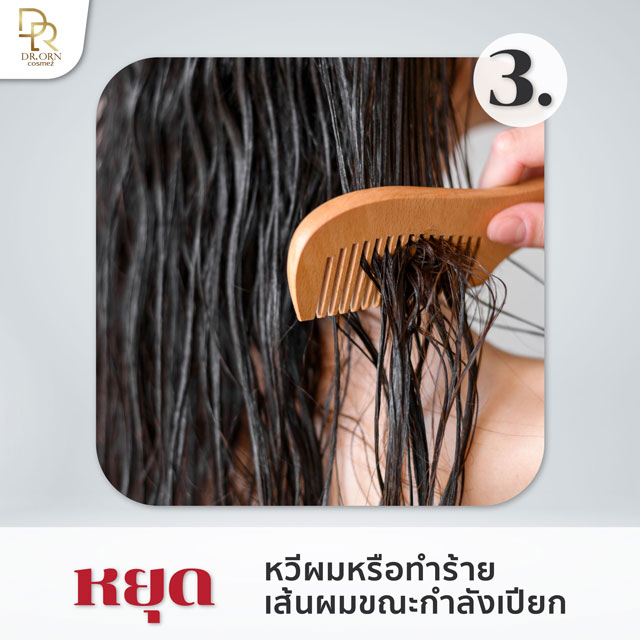 3. การหวีหรือทำรุนแรงกับเส้นผมขณะยังเปียกซึ่งเป็นช่วงที่ผมอ่อนแอที่สุดและพร้อมจะหลุดล่วงได้ หากเราเช็ดแรงๆ หรือหวีผมแรงๆ ดังนั้นควรทำอย่างเบามือและรอให้ผมแห้งสักหน่อยค่อยหวีซึ่งจะช่วยลดอาการผมร่วงได้