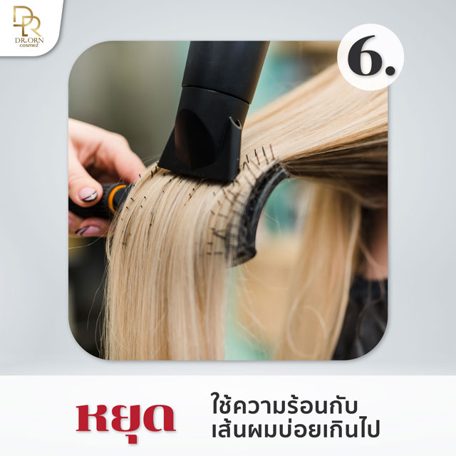 6. การใช้ความร้อนกับเส้นผมเป็นประจำ โดยเฉพาะผู้ที่เข้าร้านเสริมสวย สระผมบ่อยๆ คุณจะสังเกตว่าที่ร้านจะรีบเร่งทำให้ผมคุณแห้งเร็วที่สุดด้วยการเป่าลมร้อนถึงร้อนที่สุด ซึ่งนั่นจะทำให้ผมกรอบ แห้ง แตกปลาย ขาดความชุ่มชื้น และอาจเกิดอาการผมร่วงได้