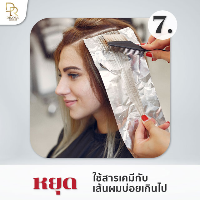 7. การใช้สารเคมีกับเส้นผมบ่อยเกินไป ไม่ว่าจะเป็นการดัด การยืด หรือการทำสีผม ล้วนเป็นสารเคมีที่ทำให้เส้นผมอ่อนแอ บางคนถึงขั้นแพ้ ไม่เพียงแต่ผมร่วง แต่ทำให้เกิดโรคผิวหนังตามมาอีกด้วย