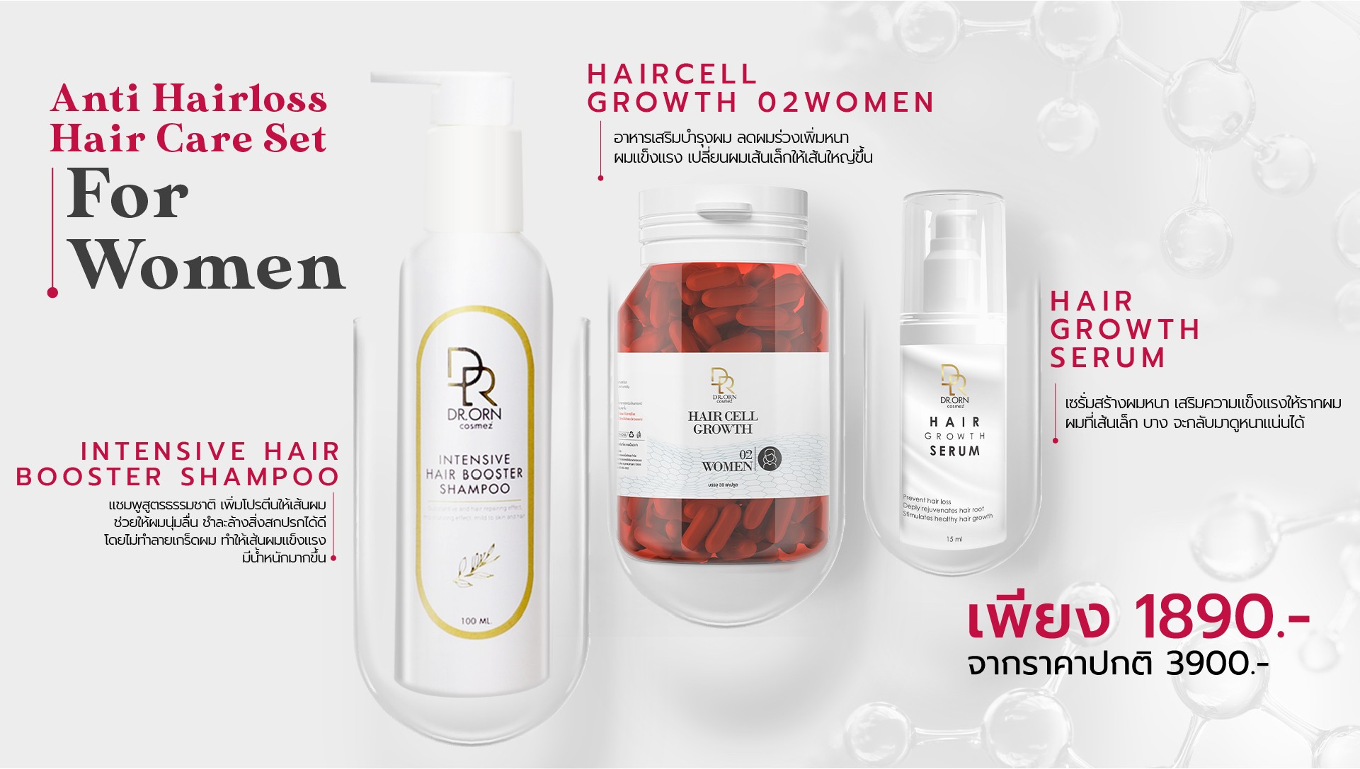 ดูแลผมด้วยผลิตภัณฑ์ Dr.Orn Cosmez ได้รับการยอมรับจากแพทย์เส้นผมทั้งในและต่างประเทศ เป็นผลิตภัณฑ์ระดับ Medical grade วิจัยใน Lab ของยุโรป มีงานวิจัยรองรับว่าปลอดภัยและเป็นผลจริงและยังได้รับรางวัลมากมาย ทั้ง Mibelle award, Advance ingredient award, Best quality hair care award