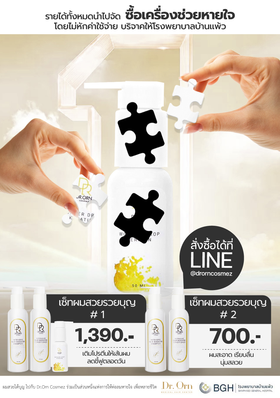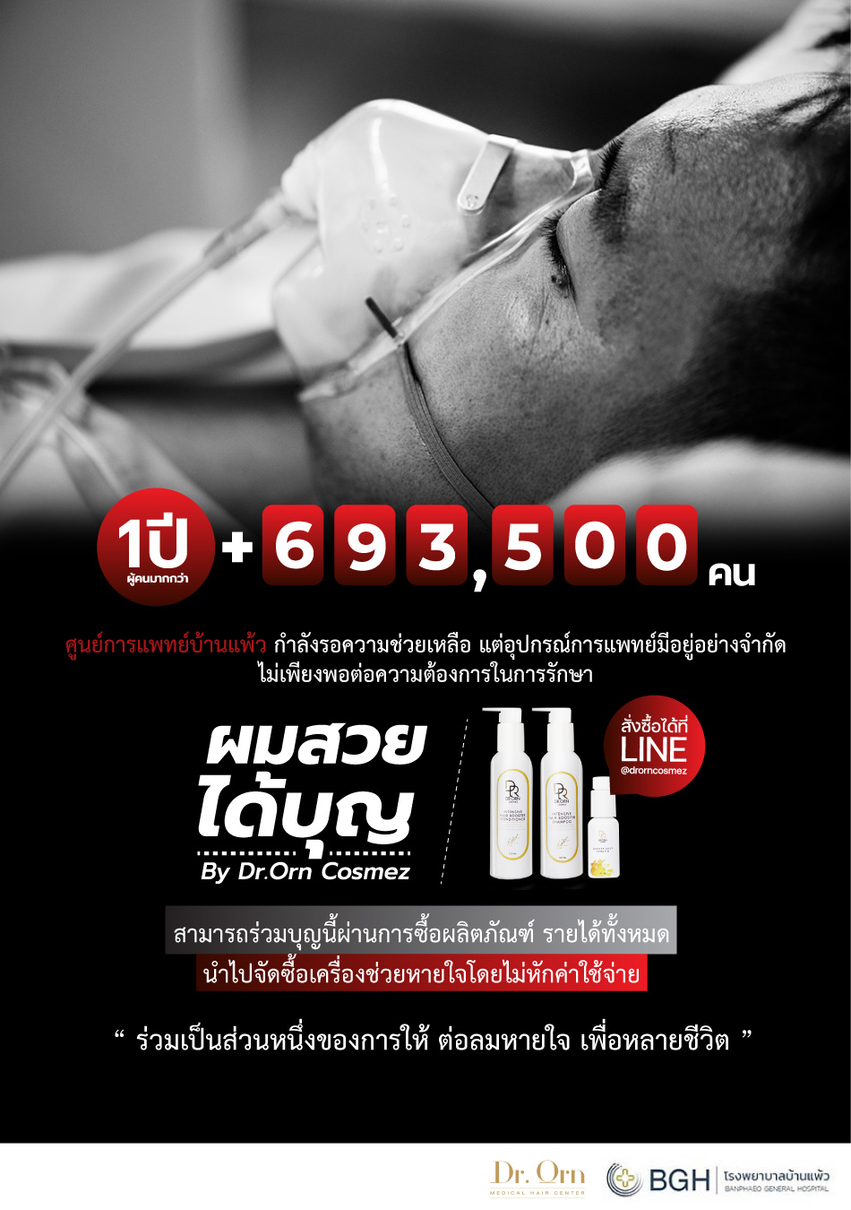 Dr.Orn Cosmez ร่วมกับ มูลนิธิ รักษ์ผม จัดตั้งโครงการ ผมสวยได้บุญ เพื่อร่วมเป็นสื่อกลาง ในการจัดซื้ออุปกรณ์ทางการแพทย์ เครื่องช่วยหายใจ ให้หน่วยแพทย์ พยาบาล โรงพยาบาลบ้านแพ้ว จังหวัดสมุทสาคร โดยสามารถร่วมกันบริจาค ได้หลายช่องทาง