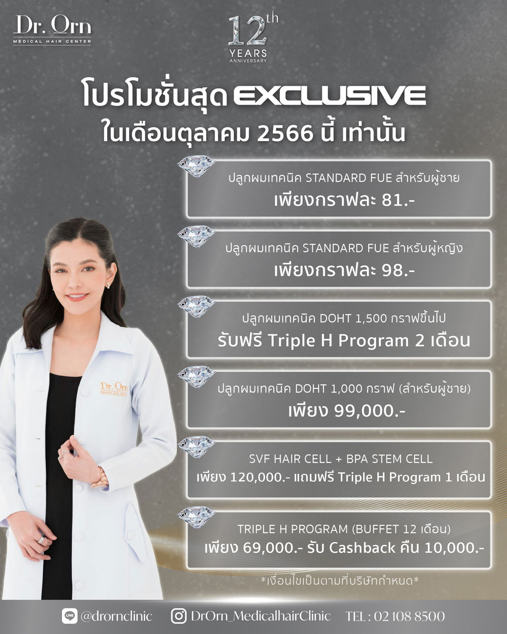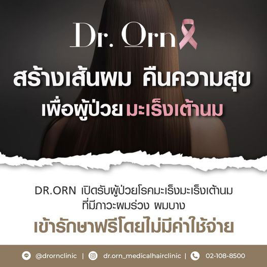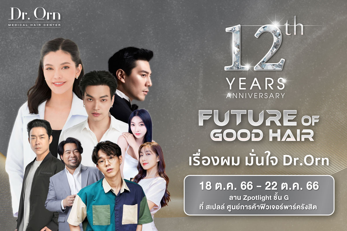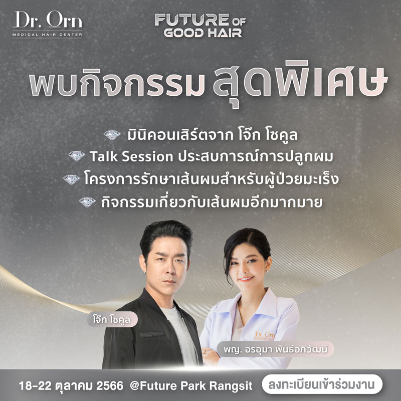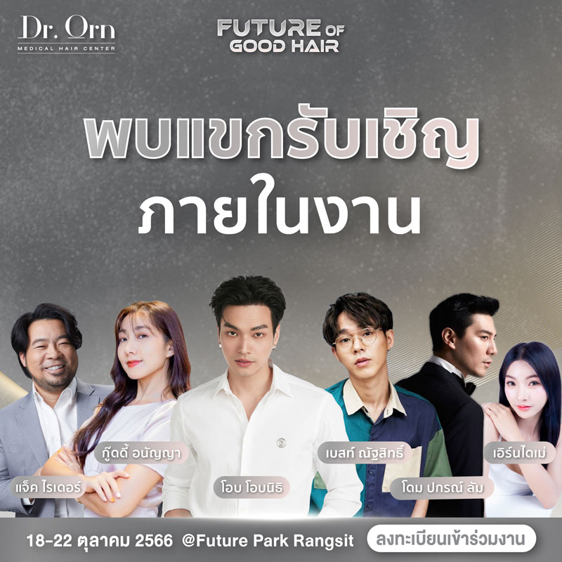 งานอีเวนท์เรื่องเส้นผมโดยศูนย์ดูแลเส้นผมชั้นนำที่ ดารา นักแสดง บอกต่อเป็นจำนวนมาก Dr.Orn Medical Hair Center พบกิจกรรมและ Talk Session จากศิลปิน ดารา และ ผู้รับบริการจริงจาก Dr.Orn เพิ่มความรู้เรื่องเส้นผมแบบถูกต้อง ป้องกันอาการผมร่วง ผมบางในอนาคต และพร้อมกำหนดอนาคตของเส้นผมของคุณไปด้วยกันได้ที่งาน Future of good hair วันที่ 18-22 ตุลาคม 2566 ลาน Zpotlight ชั้น G ที่ สเปลล์ ศูนย์การค้าฟิวเจอร์พาร์ครังสิต