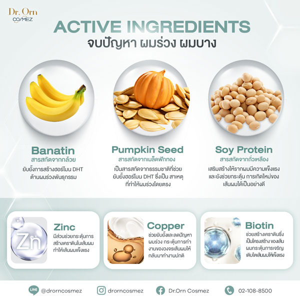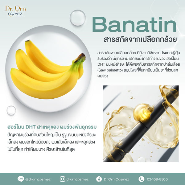 • Banatin สารสกัดจากกล้วย ยับยั้งฮอร์โมน DHT ที่เป็นปัจจัยสำคัญของผู้ชายที่ทำให้เกิดปัญหา ผมร่วง ผมบาง ศีรษะล้าน