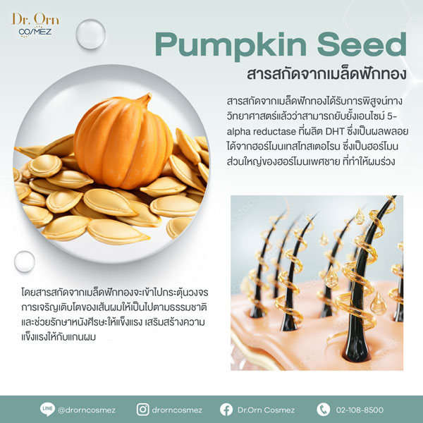 • Pumpkin Seed สารสกัดจากเมล็ดฟักทอง ยับยั้งฮอร์โมน DHT ช่วยลดอาการผมหลุดร่วง