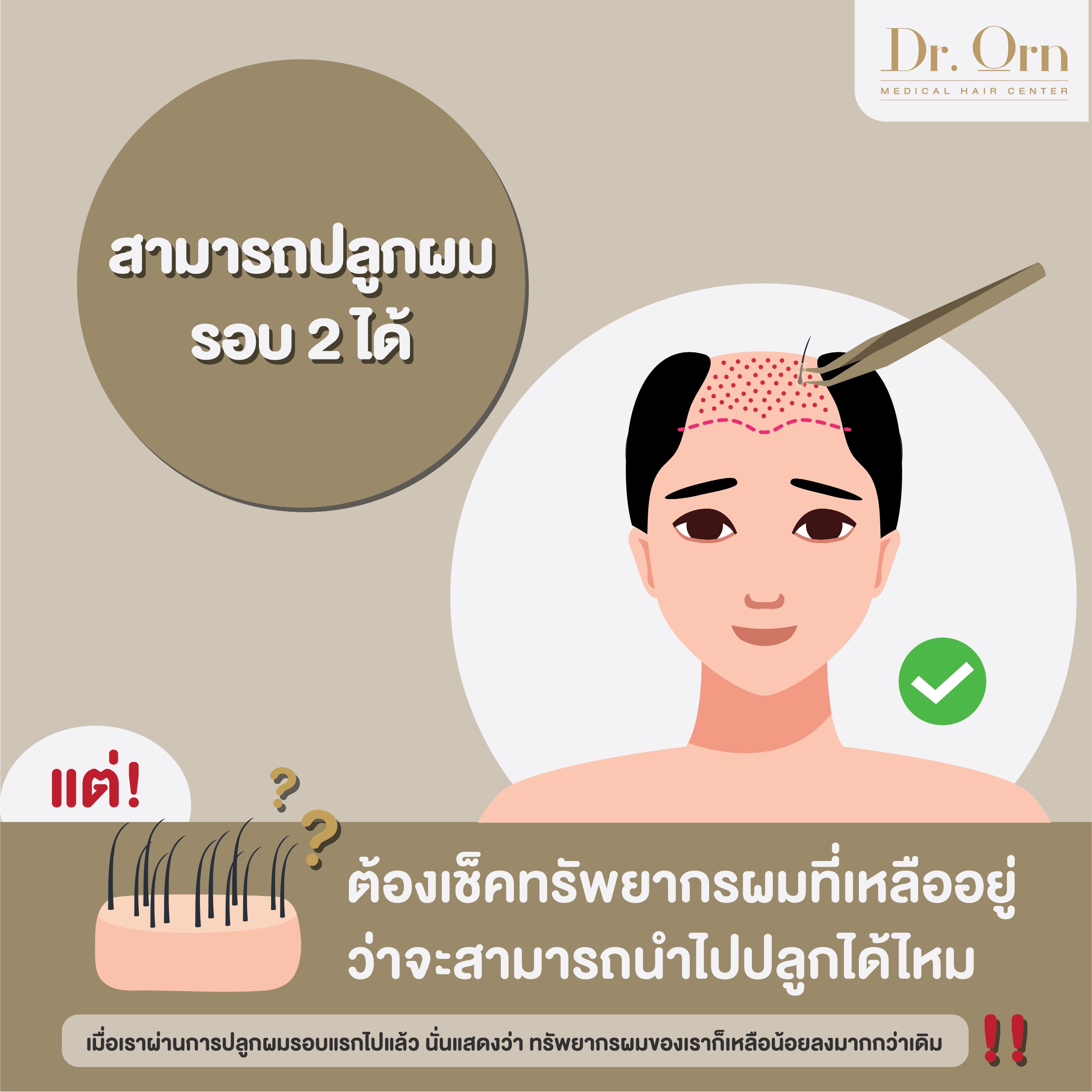 คำตอบก็คือ เราสามารถไปปลูกผมรอบ 2 ได้ แต่ทั้งนี้ทั้งนั้นขึ้นอยู่กับทรัพยากรผมของเราและการประเมินของแพทย์ว่าบริเวณที่เราจะนำรากผมออกมานั้นเพียงพอที่สามารถเจาะนำรากผมเพื่อนำมาปลูกได้ยังบริเวณที่เราต้องการได้อีกหรือเปล่า โดยบริเวณที่เราจะนำรากผมออกมานั้นปริมาณความหนาแน่นของเส้นผมก็ควรมีความเป็นธรรมชาติอยู่ ดูไม่บางจนเกินไปเพื่อผลลัพธ์ที่ธรรมชาติในระยะยาว