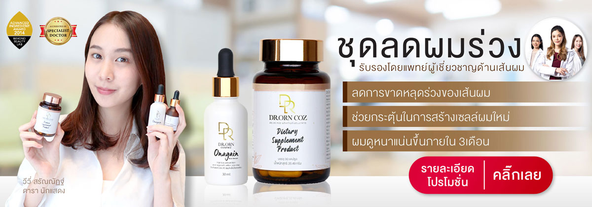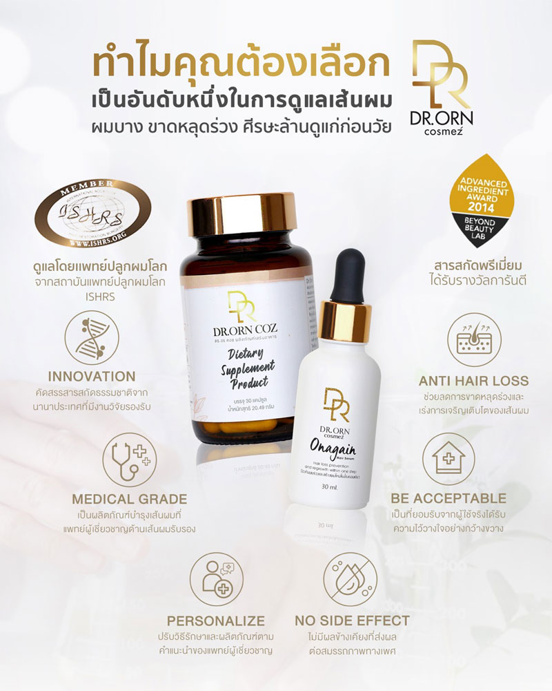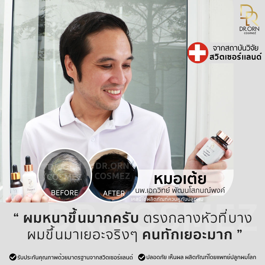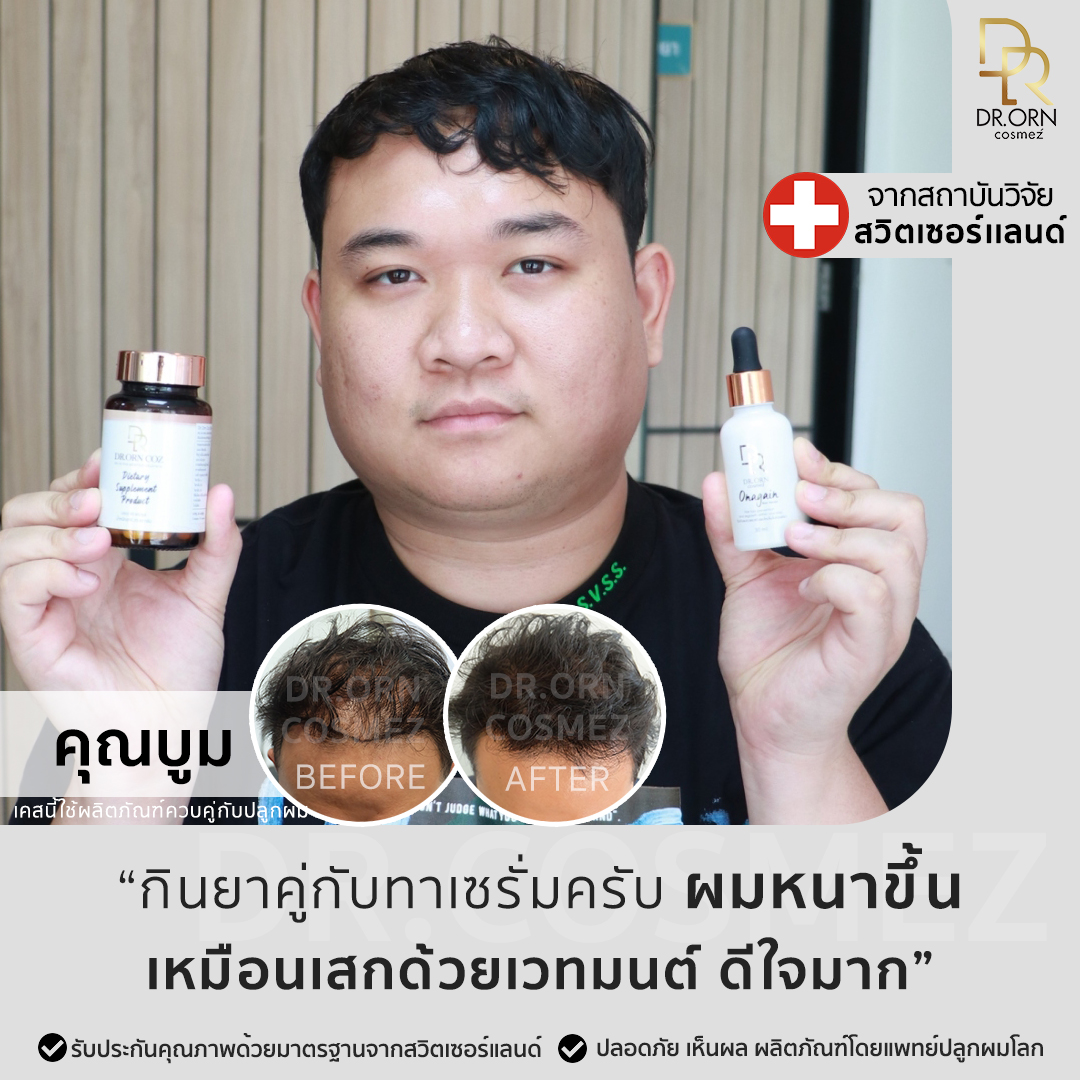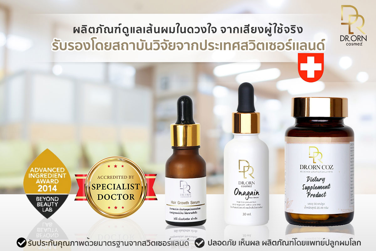 วันนี้ Dr.Orn Cosmez มีตัวช่วยให้ปัญหาเหล่านี้หายไป ด้วยเซรั่มบำรุงผมผลิตภัณฑ์นวัตกรรมจากแพทย์ผู้เชี่ยวชาญด้านเส้นผม ผ่านการพิสูจน์ทางการแพทย์ ประเทศสวิสเซอร์แลนด์ ช่วยให้ผมร่วงลดลงและไม่กลับไปร่วงซ้ำอีก